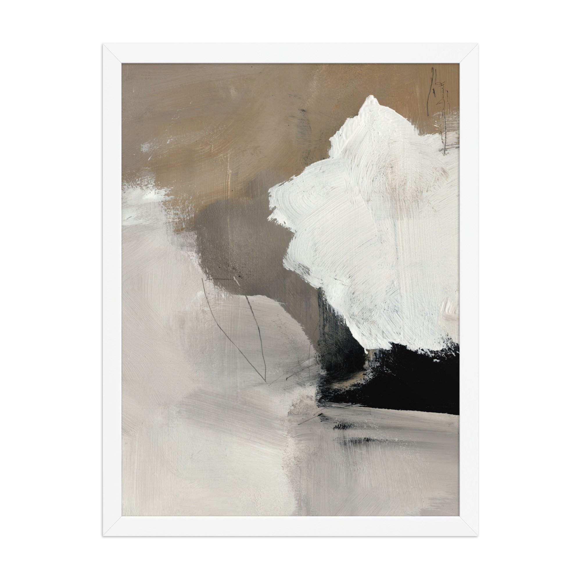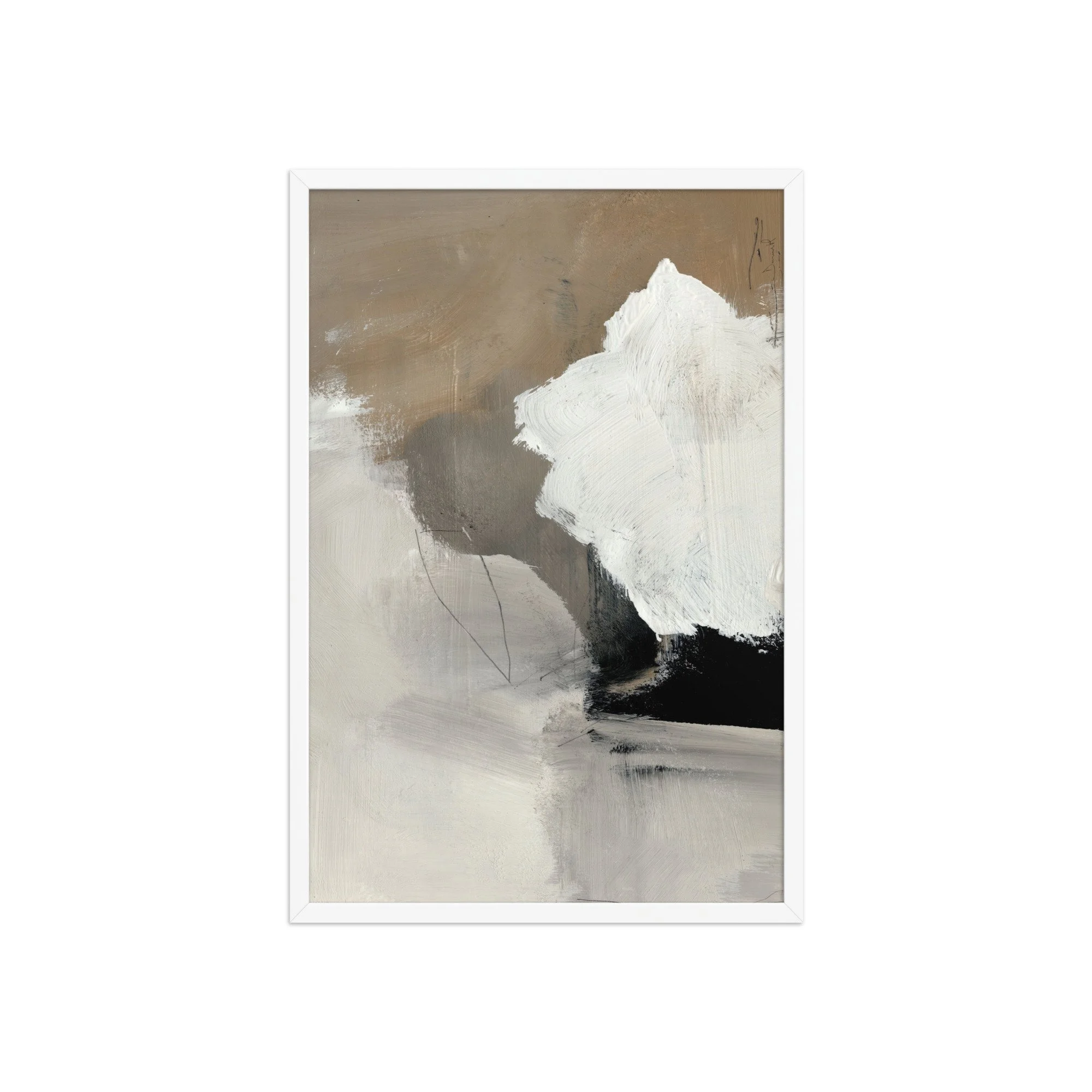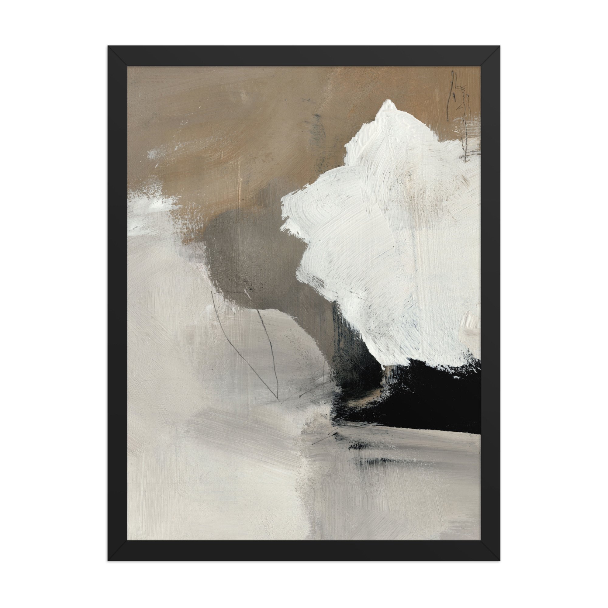 Framed Print. This abstract composition, titled "Dolomite," is a masterclass in texture and tonal balance. Bold, sweeping brushstrokes in stark white and deep carbon black collide against a backdrop of warm sand and cool grey, reminiscent of raw mineral layers. Its heavy, impasto-style texture and minimalist colour story make it a striking focal point for contemporary, industrial, or high-end transitional spaces.